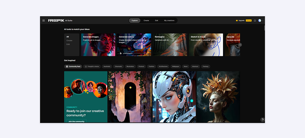 Create images, videos, audios, or even icons by simply typing in your prompt and adjusting it to your needs. With the Freepik AI video generator, crafting high-quality videos becomes just as seamless. But the possibilities of Freepik don’t end here. It also offers tools like AI design features for enhanced content creation. Easily edit photos by upscaling or enhancing them, removing or changing the background, expanding the image, or removing objects and people.