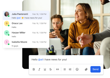 Lisa works as a marketing project manager at a fully remote digital marketing firm. She coordinates campaigns across different time zones. She uses Team Chat as the central hub for all internal communication. She creates separate group conversation channels for each client project and internal department. When the design team finishes a new set of ad creatives, they use the media sharing to instantly upload the files to the relevant project channel. When a new message appears, all channel or conversation members receive a notification about it. They can also use the search function to quickly pull up past decisions and shared files, eliminating the need to sift through emails.