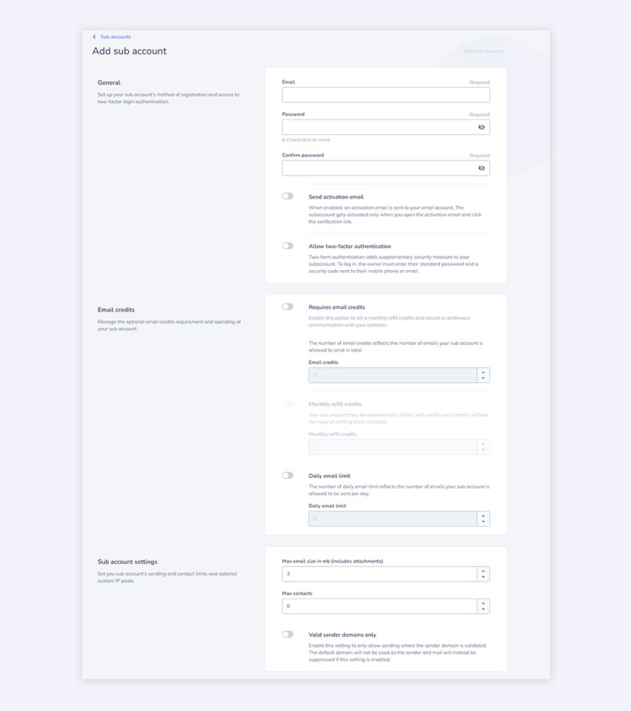 Keep in mind that subaccounts cannot purchase email credits or private IPs for themselves. They can inherit the Main Account’s verified sender domain or verify their own at any time. The Main Account can limit the monthly email-sending volume, and all emails sent by subaccounts are counted toward the Main Account’s total. All options can be edited later if needed.