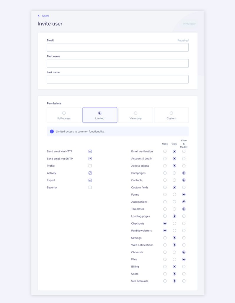 For example, you can invite a user who only has access to sending emails via SMTP and HTTP, without permissions to manage campaigns or templates. Using access tokens, this configuration works perfectly for a developer handling only integrations and transactional messages. At the same time, a designer could be given access only to templates, landing pages, forms, and files, without the ability to view contacts or generate tokens like API keys or SMTP credentials. With Users, each specialist gets exactly the access they need, keeping your team efficient and secure.
