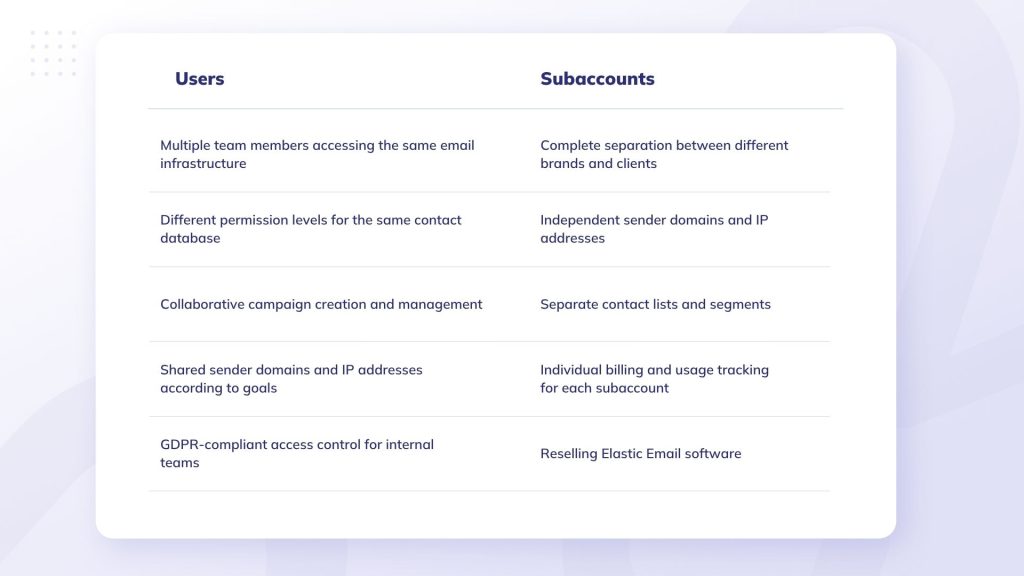 To sum up, both Subaccounts and Users play a vital role for companies, but they cannot be used interchangeably. In different situations, one of these pro features will be more suitable. For teams that need granular access control on a single account, Users is ideal. For managing multiple clients or reselling Elastic Email, Subaccounts provide the best solution. A comparison table is provided below for quick reference.