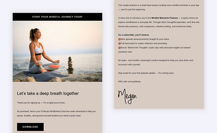 3. Megan automated a welcoming email delivering the “5-Minute Mindfulness Exercise” audio and introducing her podcast.